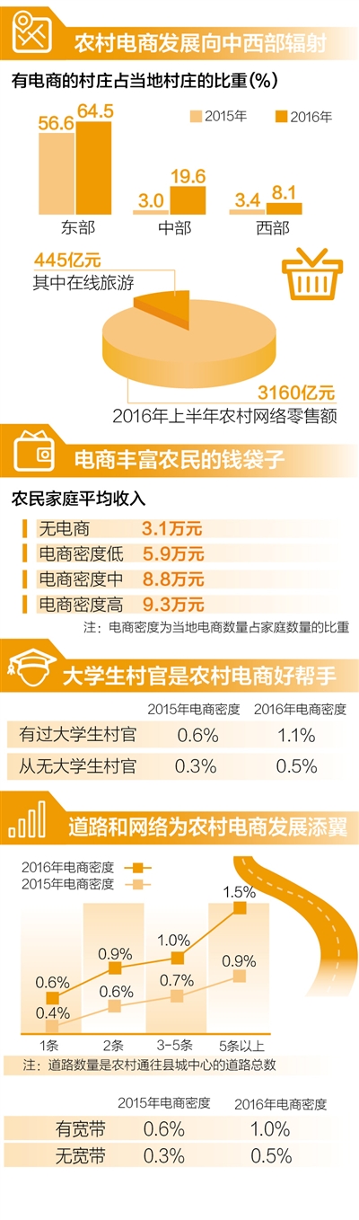數(shù)據(jù)顯示:有寬帶村莊的電商密度是無(wú)寬帶村莊的2倍;與最多只有一條道路的村莊相比,多條道路可提高農(nóng)民家庭收入1.23萬(wàn)元。
