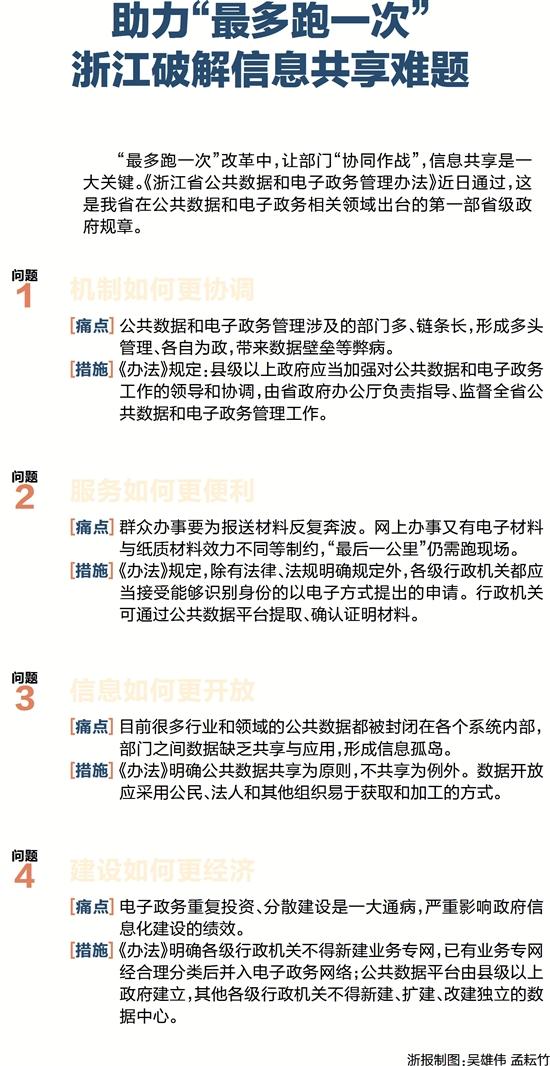“最多跑一次”改革中,讓部門“協(xié)同作戰(zhàn)”,信息共享是一大關(guān)鍵。《浙江省公共數(shù)據(jù)和電子政務(wù)管理辦法》近日通過,這是我省在公共數(shù)據(jù)和電子政務(wù)相關(guān)領(lǐng)域出臺(tái)的第一部省級政府規(guī)章。