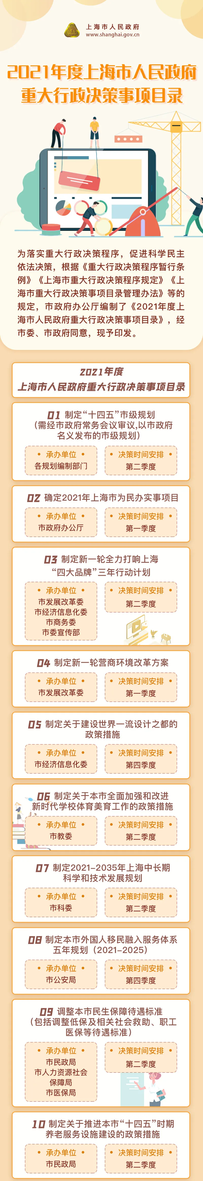 2021年度上海市人民政府重大行政決策事項(xiàng)目錄出爐