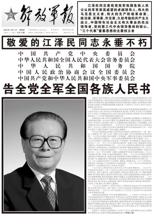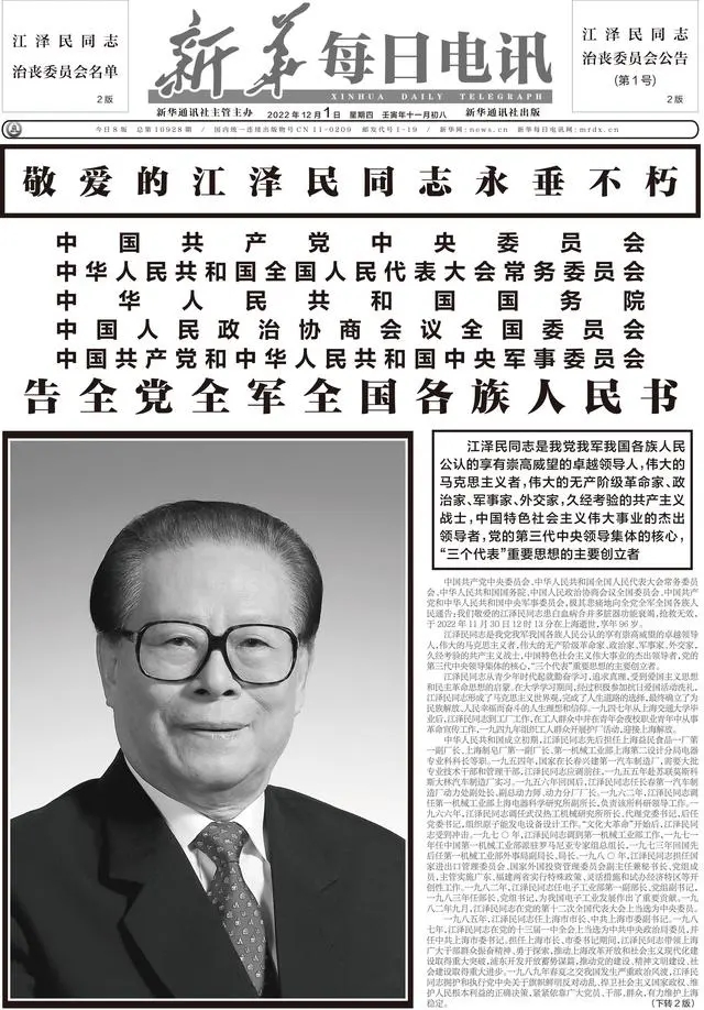 江澤民同志11月30日在上海逝世,享年96歲。12月1日出版的《人民日報》、《新華每日電訊》、《光明日報》、《解放軍報》、《中國紀檢監(jiān)察報》、《經(jīng)濟日報》等央媒在頭版集中發(fā)布告全黨全軍全國各族人民書。