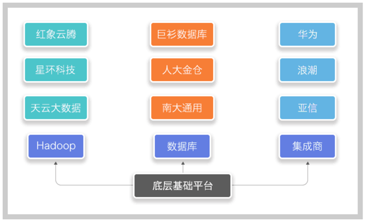 底層基礎(chǔ)平臺細(xì)分領(lǐng)域里的大數(shù)據(jù)公司眾多,有專注Hadoop發(fā)行版的星環(huán)科技、紅象云騰和天云大數(shù)據(jù),有傳統(tǒng)數(shù)據(jù)庫廠商人大金倉和南大通用,有研發(fā)新型分布式數(shù)據(jù)庫的巨杉數(shù)據(jù)庫,還有唯一來自中國的Apache社區(qū)頂級項目Kylin背后公司Kyligence。