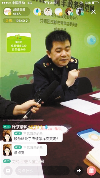 據(jù)介紹,這場由本報直播團(tuán)隊和青羊區(qū)共同舉辦的政務(wù)服務(wù)網(wǎng)絡(luò)直播活動在我市尚屬首次,在近50分鐘的直播時間里,累計吸引了9000余人次在線觀看,青羊區(qū)市場監(jiān)管局、青羊區(qū)衛(wèi)計局相關(guān)窗口首席代表在線解答網(wǎng)友提問6個,通過網(wǎng)絡(luò)直播的手段,實(shí)時在線與網(wǎng)友互動。