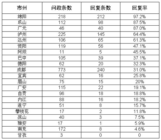 問政回復(fù)率:成都網(wǎng)友問政最熱情 綿陽回復(fù)率最高