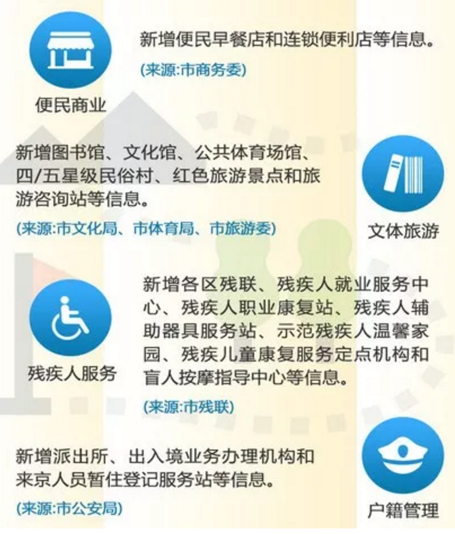 據(jù)介紹,新增的公開地圖內(nèi)容涉及教育資源、醫(yī)療衛(wèi)生機構(gòu)、社會保障服務(wù)、民政事務(wù)、便民商業(yè)網(wǎng)點、文體旅游、殘疾人服務(wù)、戶籍管理、交通管理等12類57幅,實現(xiàn)了862所公辦幼兒園、435家免疫規(guī)劃預(yù)防接種門診、1366個便民早餐店、470個殘疾人職業(yè)康復(fù)站、3064個來京人員暫住登記服務(wù)站、115個司法鑒定機構(gòu)、200個工商機構(gòu)等服務(wù)信息一站查詢、一覽無余。